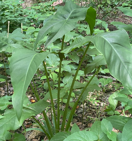 An aquatic perennial native to the eastern United States. It grows long stalks topped with a singular large, arrow-shaped leaf. This species is abundant in shallow waterways and can be found growing in large colonies. Green Arrow Arum grows slowly up to three feet tall. It produces clusters of small black berries.