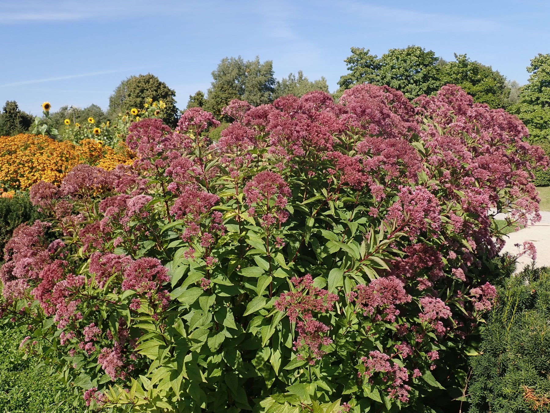 Eutrochium maculatum, commonly known as Spotted Joe Pye Weed, is native to damp meadows, thickets and coastal areas in eastern North America. Plants typically grow 4-6’ tall on branched, purple-speckled stems clad with serrate, lance-shaped, medium green leaves (to 8” long) that typically appear in whorls of 3-6. Tiny, light to deep purple flowers in compound inflorescences bloom from mid-summer to early fall. Attracts butterflies.